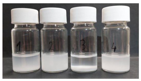 Sedimentation of HAp powder after 10 min in deionized water (1), isopropanol (2), acetonitrile (3) and 3:2 isopropanol:acetonitrile mixture (4).