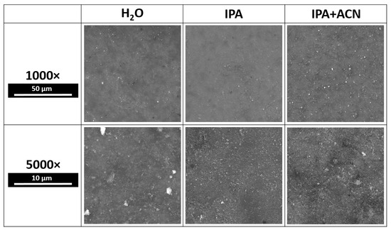 Samples were deposited on Ti6Al4V alloy and Si substrates as described in the experimental section. SEM images of samples prepared using different solvents are presented in Figure 4.