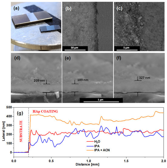 (a) Photograph of HAp coatings on Ti6Al4V substrate (larger) and silicon (smaller); (b,c) SEM images of exemplary coating surface borders deposited from IPA + ACN matrix on Ti6Al4V substrates; (d–f) cross-sectional SEM images with marked average layer thickness of HAp coatings on Ti6Al4V substrate deposited from (d) H20, (e) IPA, (f) IPA + ACN matrices; (g) profilometry of synthesized HAp coatings.