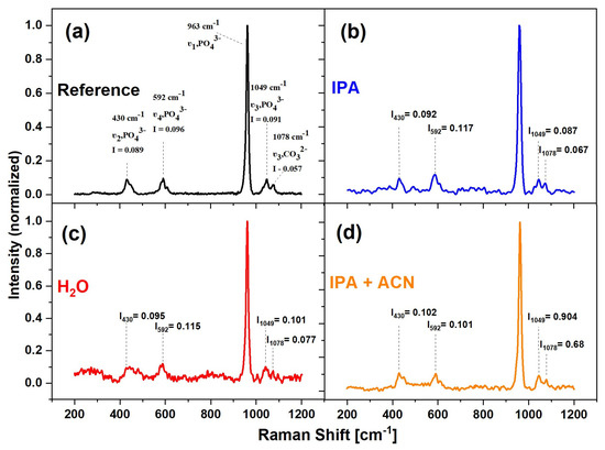 Comparison of Raman spectra of (a) reference HAp microparticles, synthesized HAp coatings using different matrices: (b) water, (c) isopropanol, and (d) isopropanol:acetonitrile mixture; normalized to 965 cm−1 band.