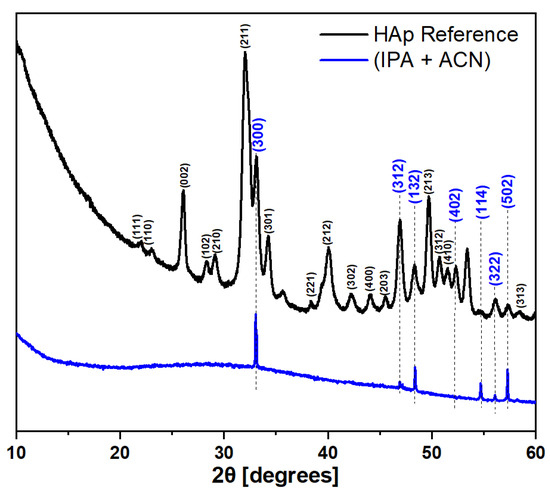 To analyze the crystallinity of the samples, X-ray diffraction was performed. The results are presented in Figure 7. As a reference sample, a drop-cast suspension of HAp particles on Ti substrate was used. Due to negligible differences between patterns of the MAPLE samples synthesized from different matrices, a single representative pattern from the IPA + ACN sample is presented. The XRD pattern of the reference sample represented as a black line agrees with other ones presented in other publications that present XRD of HAp nanoparticles [33,34,35]. On the other hand, the MAPLE-synthesized coating XRD pattern (blue line) significantly differs from the reference. Only a small part of the original pattern reflections is present. Among these reflections, there is a (300) reflection, which has the highest intensity in the reference pattern, and one (XX4) and five (XX2) reflections. The authors have encountered this effect in previous studies on the subject of MAPLE deposition [26]. HAp crystallites are more likely to attach to a substrate surface by the certain spatial configuration that creates a distinct texture effect [36,37]. Reinforcement of the reflections with particular Miller indices shows that crystallites are preferably placed on the substrate perpendicular to the c-axis of the hexagonal HAp unit cell.