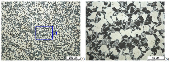 Microstructure of the Aluminum Ceramic Composite (AMC) used in the study (DURALCAN F3S.10S). The microstructures of the samples were revealed after etching in the Mi2Al reagent according to the PN-75/H-04512. The microstructure observations of the above samples were performed at image magnifications of 100× (a) and 500× (b) [35].