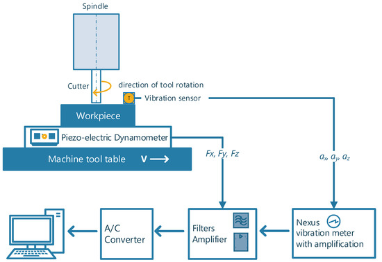 Because the cutting force varies dynamically, it causes varying deformations of the M-F-W-T system (Machine tool-Fixture-Workpiece-Tool). The movements of the machine tool components, in particular the rotation of the tool (in milling) or of the workpiece (in turning), are transformed into vibro-acoustic processes, vibrations, and acoustic emissions that occur in and around the machine tool’s mechano-acoustic system. The externally measured signal is the response of the dynamic system of the machining system with a certain transmission to the sum of the cutting force excitations [12,13].
