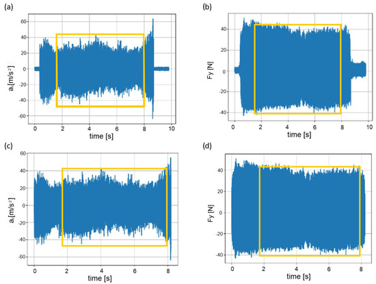 (a–d). Example signal recordings of vibration acceleration and force (a,b), and cut sections of tool input and output in and out of the workpiece material (c,d).