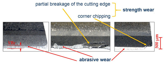 The photos in Figure 5 show examples of tool wear observed during the tests. In each of the cases shown, the wear in the form of abrasive wear of the flank surface dominates. There is also strength wear on the edge of the blade, in the form of chipping of the corners and partial fracture of the cutting edge. However, these forms of wear are random, i.e., they appear only in some cases. Based on the above, the width of abrasive wear of the flank surface, VBc [mm], was adopted as the tool wear criterion.