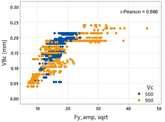 To illustrate the nature of the relationship between the tool wear and the diagnostic measures, Figure 6 shows a sample relationship for one of the signal measures (Fy_amp_sqrt). A significant scatter of values can be seen, which is reflected in the relatively low Pearson correlation coefficient (0.696). The graph also shows that the measured values obtained during milling at a speed of vc = 900 m/min “overlap” with the values obtained during cutting at a speed of vc = 500 m/min.