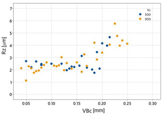 In order to determine the critical value VBc for the classification model, the relationship between VBc and the surface roughness parameter Rz was determined (Figure 7).