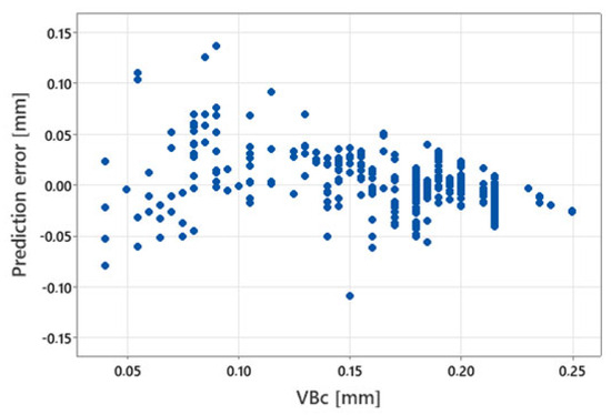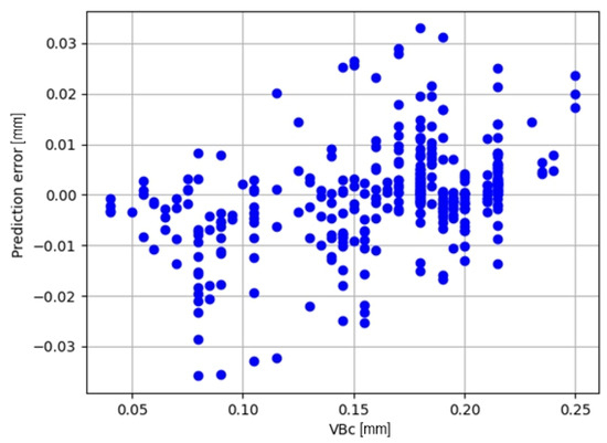 The value of the coefficient of determination determined on the test set for the best RF model decreased from R2 = 0.957 to R2 = 0.949 (RMSE = 0.1896, σ-RMSE = 0.0021), while the maximum absolute prediction error did not exceed 0.038 mm. The model still seems useful. The resulting prediction errors for the test set are shown in Figure 10.