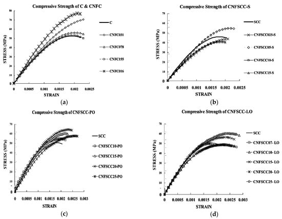 It can be noted from Figure 1 that the stress–strain curves of CNF concrete and normal concrete are similar, and the only difference is in the strength and peak strain of the concrete. This means that the constitutive model for standard concrete can also be used for CNF-reinforced concrete [23].