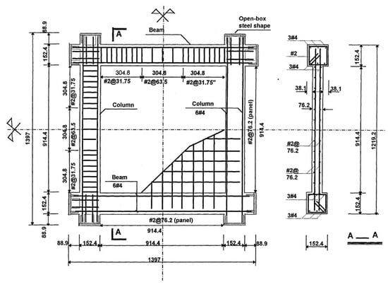 The University of Houston [16] conducted tests to assess the performance of nine 1/3-scale framed shear walls. These walls were subjected to a constant axial force at the top of each column and a cyclic load in the reverse direction at the top beam. The dimensions of the wall were 914.4 mm by 914.4 mm, with a thickness of 76.2 mm. The boundary columns displayed a cross-sectional area of 152.4 mm2, as depicted in Figure 2. The reinforcement features of the specimens are also illustrated. The bottom left and right corners of the specimen were supported by a hinge and a roller, respectively. Figure 3 presents the fracture pattern and failure mode of specimen FSW-6 as observed during the experiment.