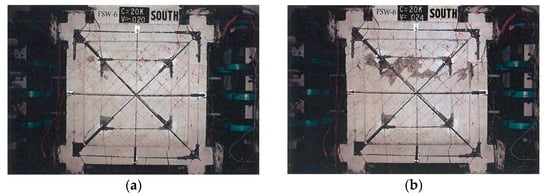 Crack pattern and failure mode of FSW-6. (a) Initial concrete crushing. (b) Final failure.
