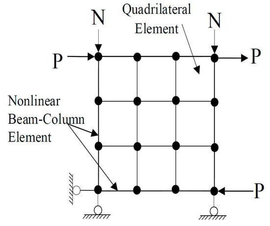Finite element evaluations were performed on the two specimens. Figure 4 illustrates the specimens modeled using the finite element mesh. The wall panel consisted of nine RCPlaneStress quadrilateral parts derived from the Cyclic Softened Membrane Model (CSMM) [19,20,21]. The boundary columns and beams are represented as nonlinear beam-column elements, the pre-existing element types in OpenSees [22]. Each beam and column were partitioned into three components. The columns experienced axial loads that were delivered as vertical nodal forces, which were kept constant throughout the study.