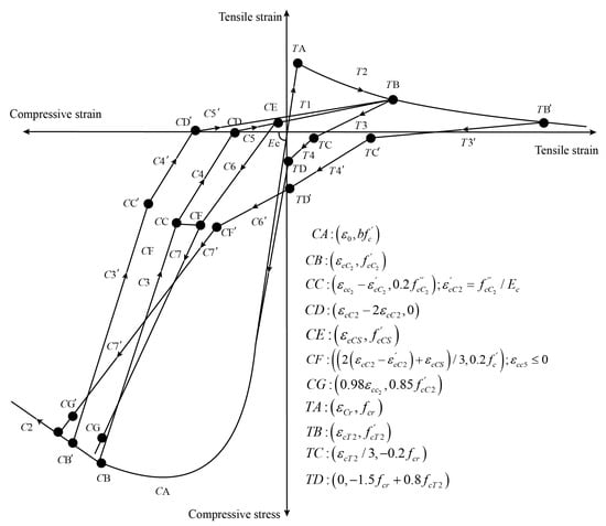 Based on the uniaxial constitutive law of concrete in CSMM, the cyclic uniaxial constitutive relationships of carbon nanofiber-reinforced concrete can be modified as shown in Figure 6. The characteristic of these concrete constitutive laws includes the softening effect in compression due to the tensile strain in the perpendicular direction, the softening effect in compression under reversed cyclic loading, and the opening and closing of cracks, which are taken into account during the unloading and reloading stages.