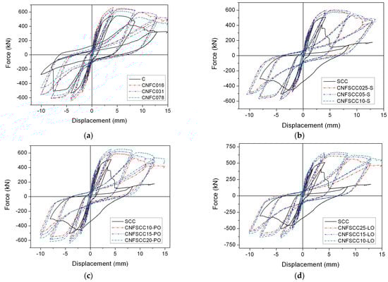 On the other hand, the shear force capacities of shear walls reinforced with CNF are also higher than those without CNF. In the case of normal concrete, the highest increase in shear force capacity is 21.82%, which happens in the case of CNF016. For the self-consolidating concrete, the highest increase in shear force capacity is 30.37%, which happens in the case of CNFSCC10-LO. In the three kinds of SCC with different CNFs, the average increase in shear force capacity follows the order of CNFSCC-LO > CNFSCC-PO > CNFSCC-S. It is noted that the increases in shear force capacity are not as obvious as the increases in ductility of all the shear walls, which means, for FSW-4, carbon nanofiber-reinforced concrete has a better effect on the ductility than the shear force capacity.