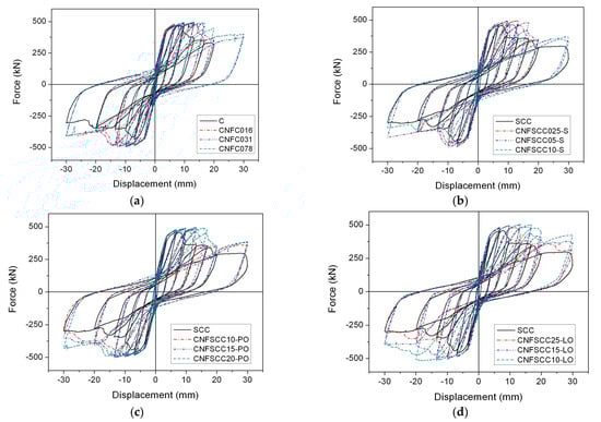 Shear force-drift displacement curves of FSW-6. (a) CNFC. (b) CNFSCC-S. (c) CNFSCC- PO. (d) CNFSCC-LO.