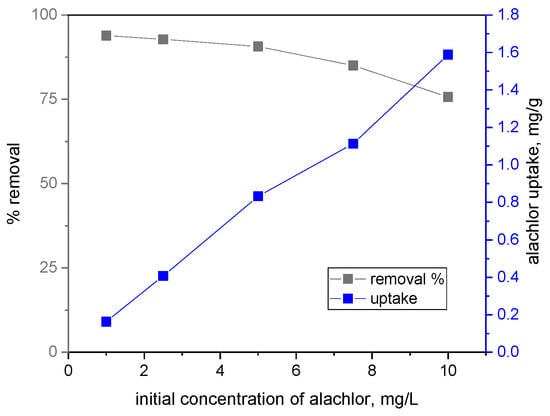 3.2. Performance of Wheat Grain Biochar in Removing Alachlor from Water