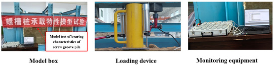 As shown in Figure 2, the test loading device consisted of a static loading system, monitoring equipment, and a model box. A static force was applied to the pile using the loading system consisting of reaction frames, jacks, and loading plates on the upper part of the model box. The monitoring equipment included strain gauges, settlement meters, and data-acquisition devices. A DH5922D stress–strain analyzer obtained from Jingjiang Donghua Co. Ltd. (Taizhou, China) was used for test acquisition, and the maximum sampling frequency of the acquisition device was 50 Hz. This study used a slow-sustaining loading method for graded loading. The loading standard refers to building pile testing technology code JGJ106-2014 [27]. Readings were taken at the 5th, 15th, and 30th min of loading, after which readings were taken once every 30 min. A settlement meter measured the settlement at the top of the pile. When two settlements did not exceed 0.01 mm/30 min, the next level of loading could be performed. Seven uniformly spaced strain gauges were symmetrically pasted on the screw-groove pile and the circular pile to monitor the strains along the buried depth direction under graded loads. Insulating tape protected the strain gauges and collection wires from damage during loading.