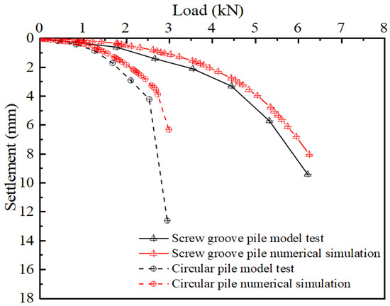 The ultimate bearing capacity of the pile was determined based on the load–settlement curves obtained from the tests, as shown in Figure 4, for both the circular and screw-groove piles. In the early loading stage, the two settlement curves coincided, showing a gentle linear change. At this stage, the pile was less loaded, and the pile type had little influence on the bearing capacity. As the load increased, the settlement of the screw-groove pile gradually became smaller than that of the circular pile, and the occlusion of the screw groove with the soil slowed the settlement of the screw-groove pile. The load–settlement curve of the circular pile showed a steep drop in the later stages of loading, and the ultimate capacity of the pile was 2.54 kN. The screw-groove pile exhibited prominent slow-change characteristics compared with the circular pile; according to building pile testing technology code JGJ106-2014, the slow-change load–settlement curve of the pile should be selected to settle 40 mm for its ultimate bearing capacity. When the top of the pile settlement reached 4 mm (a geometric similarity ratio of 10), the ultimate bearing capacity of the screw-groove pile was 4.71 kN. The ultimate bearing capacity of the screw-groove pile was increased by 1.85 times compared to that of the circular pile.