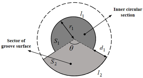 From the perspective of energy savings, the ratio of the ultimate load of the pile to the volume of the pile is considered the material utilization rate [30]. Nevertheless, the cross-section of the screw-groove pile is complex as shown in Figure 5, and its sectional properties must be analyzed to calculate its volume. The cross-sectional area was calculated by dividing the area into two regions: S1 and S2. S1 is the inner circular section with a radius of r and an angle of (2π − θ). S2 is the sector of a grooved surface with a radius of (r1 + d1) and an angle of θ. Based on the structural analysis of the screw-groove pile shown in Figure 4, the formula for the angle of the region can be expressed as follows: