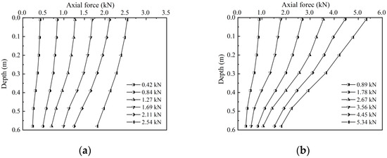 The axial force and skin friction resistance of the circular and screw-groove piles were evaluated as follows: