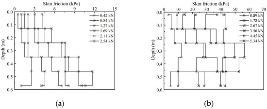The characteristic curves of the axial force distributions of the circular and screw-groove piles are shown in Figure 6. The distribution characteristics of the axial force of both pile types decreased gradually along the longitudinal direction of the piles. In contrast, the toe resistance of the pile increased gradually with the load. The decrease in the screw-groove pile was larger than that in the circular pile. Owing to the bearing capacity of the screw-groove structure and the enhancement of the skin friction resistance, the upper load can be shared to reduce the toe resistance of the pile. For the circular pile, when the ultimate load was reached, the toe resistance of the pile was 1.61 kN, approximately 63% of the total ultimate bearing capacity of the pile. Conversely, for the screw-groove pile, with slow settlement deformation, the toe resistance was 4.45 kN and 5.34 kN at loading values of 1.52 kN and 1.81 kN, respectively, which is about 34% of the bearing capacity. Figure 7 illustrates the contrast in the skin friction resistance characteristics between the circular and screw-groove piles. The screw-groove piles exhibited a significantly higher frictional resistance than the circular piles because of their distinctive screw-groove structure, which facilitates interlocking effects with the soil. This enhanced the skin friction between the pile and the soil, increasing the pile-bearing performance. In contrast, the frictional resistance contributed by the cross-sectional area of the circular piles was minimal. In practice, the main difference between circular and screw-groove piles lies in the extent to which the skin frictional resistance is mobilized. At the ultimate load capacity, the frictional resistance of circular piles is primarily derived from the shear strength at the pile–soil interface. In contrast, screw-groove piles benefit from the mechanical interlocking effect of their screw-groove structure. The skin resistance of screw-groove piles encompasses not only the shear strength at the screw-groove surface (comprising the arc length of the inner circular section and the arc length of the groove surface sector) but also a series of base resistances formed by the screw-groove surfaces, thereby cumulatively enhancing the skin resistance of the pile.