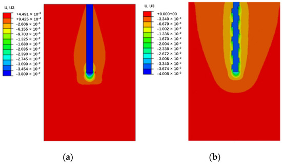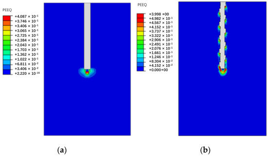 To investigate the load-transfer characteristics of the circular and screw-groove piles in depth, a numerical model was segmented along the X-Z plane as the cutting plane. Figure 7 and Figure 8 illustrate the pile–soil displacement and foundation response characteristics of the piles under ultimate bearing loading conditions. The macroscopic response of the circular pile in the soil involved an evident soil deformation at the pile tip (Figure 8a) and the formation of a high-plasticity strain zone (Figure 9a). Skin resistance arises from the friction between the circular pile and the soil, with the soil layer at the pile tip being the primary load-bearing zone for the pile. In the ultimate bearing state, the vertical displacement range of the screw-groove pile increased significantly, mainly because of the extensive involvement of soil in the bearing capacity through large-scale interaction between the screw-groove structure and the soil. Significant soil deformations (Figure 8b) and highly plastic deformations (Figure 9b) occurred in both the screw-groove structure and the pile tip. The toe resistance at the screw-groove surface originates from the shear strength between the screw-groove structure and the soil around the pile. Therefore, the screw design of the pile increased the contact area between the pile and the soil, thereby enhancing the bearing capacity of the pile. The foundations of the two types of piles exhibited significant differences in their stress characteristics and soil failure modes under vertical loading compared with conventional single-pile end bearing. Unlike ordinary circular piles that rely on single-pile end bearing, screw-groove piles utilize a unique screw-groove structure to form a multipoint end-bearing mode between the screw groove and pile ends. Their unique cross-sectional properties simultaneously enhance both the end-bearing capacity and the skin friction resistance, thereby significantly improving the vertical load-carrying performance of the pile.