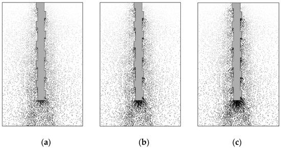 Distribution of stress field of screw-groove pile under different loads: (a) 1.78 kN, (b) 3.56 kN, and (c) 4.71 kN.