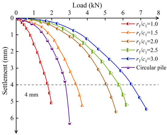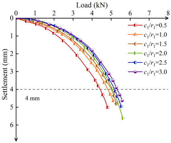 The load–settlement curves for different screw-groove thicknesses are shown in Figure 16. The ultimate bearing capacities for c1/r1 at 0.5, 1, 1.5, 2, 2.5, and 3 were 4.43 kN, 4.87 kN, 5.03 kN, 5.09 kN, 5.17 kN, and 5.32 kN, respectively. When c1/r1 increased from 0.5 to 1.5, the ultimate bearing capacity increased by 13.52%. However, c1/r1 from 1.5 to 3 only resulted in a 5.79% increase. This indicates that increasing the screw-groove thickness can enhance the ultimate bearing capacity, but the rate of increase is limited. Analyzing the increase in the thickness from the perspective of the screw-groove pile cross-section, it only enhanced the pile–soil contact area, thereby increasing the skin friction resistance, with no significant increase in the bearing capacity of the screw-groove structure’s bottom. Therefore, the increase in the load-bearing capacity is limited.
