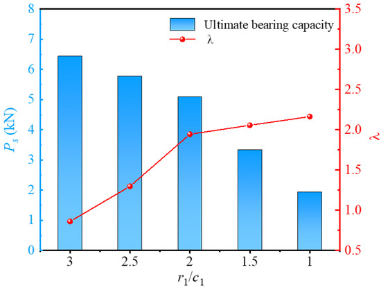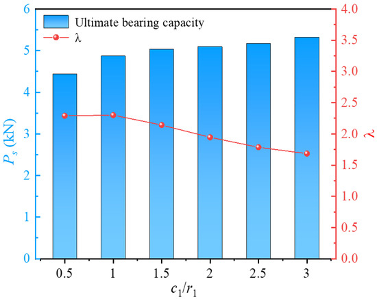 Solely analyzing the ultimate bearing capacity reveals that increasing the inner radius leads to a notable enhancement in the bearing capacity. However, this increase in inner radius inevitably increases material consumption, potentially escalating costs and reducing resource utilization efficiency. From an economic and low-carbon perspective, material utilization efficiency is also a crucial indicator in the design and use of precast piles. Based on this, the material utilization factor λ = (Lb − La)/L, where La is the material utilization rate of piles with circular piles and Lb is the material utilization rate of screw-groove piles, was also investigated. Figure 13 shows the variation curves of the ultimate bearing capacity (Ps) and material utilization factor under different screw-groove inner radii. However, the ultimate bearing capacity increased with an increase in the inner radius of the screw groove. The utilization factor decreased significantly. As r1/c1 increased from 1 to 3, the factor influencing material utilization decreased from 2.16 to 0.86. Decreasing r1/c1 from 3 to 1 led to a 151.16% decrease in the utilization factor. Under the conditions of this study, when r1/c1 was less than 2, the ultimate bearing capacity of the pile increased significantly. This is because the skin and toe resistances of the pile were significantly enhanced, owing to the influence of the inner radius, and the contact area of the pile–soil interface was significantly increased, thereby strengthening the load-bearing capacity of the pile. However, when r1/c1 was greater than 2, although the effect of increasing the pile–soil interface area enhanced the bearing capacity, the material utilization rate decreased significantly. In actual engineering design, the material utilization of the pile should be fully considered while emphasizing the vertical bearing capacity. A huge screw-groove inner diameter can lead to decreased material utilization, whereas a minimal inner diameter results in a poorer load-bearing capacity.