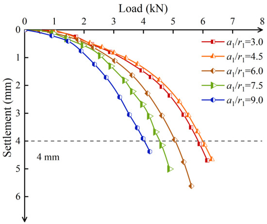 Figure 14 shows the load–settlement curves of screw-groove piles with different screw-groove spacings. The variation trend of the bearing capacity of the piles with increasing screw-groove spacing generally exhibited a two-stage development characteristic, initially increasing and then decreasing. The ultimate bearing capacities of the piles with spacing-to-inner radius ratios (a1/r1) of 3, 4.5, 6, 7.5, and 9 were 5.66 kN, 5.98 kN, 5.09 kN, 4.53 kN, and 4.02 kN, respectively. The screw-groove spacing significantly affected the bearing performance of the pile. When the ratio a1/r1 increased from 3 to 4.5, the ultimate bearing capacity increased by 5.65%. However, when a1/r1 increased from 4.5 to 9, the ultimate bearing capacity decreased by 32.80%. Minimal spacing can inhibit the transmission effect of the screw-groove pile’s bearing capacity, affecting the diffusion of the pile top load into the surrounding soil and leading to poor bearing performance of the pile. However, a vast pitch reduces the skin friction resistance of the pile and the end-bearing capacity of the screw-groove surface, which is unfavorable for load transfer, thereby weakening the pile–soil shear interaction and resulting in reduced bearing performance.