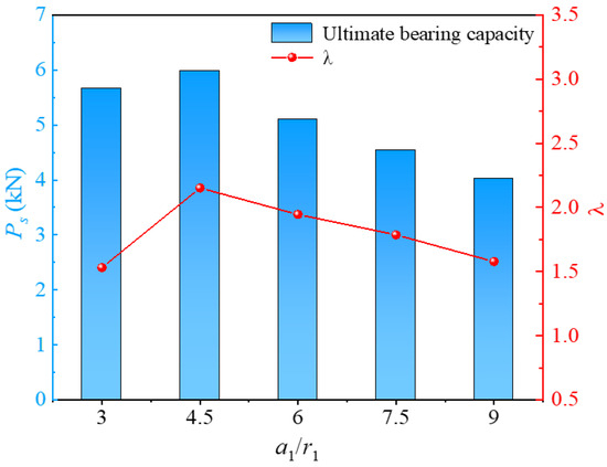 Figure 15 shows the impact factors of material utilization with increased screw-groove spacing. The material utilization factor of the screw-groove pile and the ultimate bearing capacity exhibited a trend of first increasing and then decreasing. When a1/r1 increased from 3 to 4.5, the utilization factor decreased by 40.52%. Conversely, when a1/r1 decreased from 9 to 4.5, the utilization factor increased by 36.08%. The trends of changes in the bearing capacity and the utilization rate indicate the existence of an optimal screw-groove spacing that balances economic factors and bearing-capacity demands. Based on the parameters calculated in this study, the optimal ratio was determined to be between 4.5 and 6. In this range, the screw-groove pile effectively mobilizes a larger volume of soil to participate in bearing loads, thereby fully utilizing the bearing capacity of the soil. Consequently, actual engineering designs should consider this optimal screw-groove spacing to meet the dual economic and bearing-capacity needs.