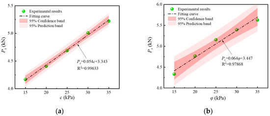 Experimental and analytical calculations showed that the end-bearing capacity of screw-groove piles is strongly correlated with these soil parameters. The Anderson–Darling test [31] was employed to assess the normality of the data, with a significance level set at 0.05. If the p-value derived from the test exceeds 0.05, the null hypothesis that the cohesion and internal friction angle follow a normal distribution is accepted. The p-values for the two datasets were 0.86 and 0.83, respectively, both exceeding the threshold of 0.05, thereby supporting the assumption that the data followed a normal distribution. Additionally, no outliers [32] or extreme values [33] were detected in the data. Figure 18 illustrates the correlation analysis of different cohesion values and internal friction angles with bearing capacity, revealing correlation coefficients of approximately 0.996 and 0.979, respectively, indicating a good fit. When the cohesion increased from 15.0 kPa to 35.0 kPa, the bearing capacity rose from 4.13 kN to 5.22 kN—an increase of 26.50%. Similarly, when the internal friction angle increased from 15° to 35°, the bearing capacity rose from 4.33 kN to 5.63 kN, representing an increase of 29.86%. The bearing capacity increased with both the cohesion and the internal friction angle. These results indicate that the cohesion and internal friction angle significantly influence the bearing performance of screw-groove piles. The soil parameters affect the shear-bearing capacity of the soil, and the shear strength influences the interlocking action between the screw grooves and the soil. Therefore, the performance of screw-groove piles is highly sensitive to soil parameters, and practical engineering designs must consider the local soil conditions to leverage the inherent bearing capacity of the soil efficiently.