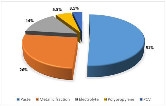 Scrap from used lead–acid batteries from many types of vehicles, due to its environmental protection and economic aspects, has become the dominant raw material for lead production in the world [1]. The production of 1000 kg of lead from recycled batteries reduces the energy demand by 35–40% compared to the production of the same amount of lead from raw materials [2]. The starting point for processing used batteries is their dismantling and separation into individual fractions. During battery recycling, lead is recovered from the metallic fraction and from the battery paste. The proportions of the different fractions that make up a lead–acid battery are shown in Figure 1. The processing of battery paste, in which lead occurs in compounds with oxygen and sulfur (PbSO4, PbO, PbO2, PbS), is carried out in pyrometallurgical and hydrometallurgical processes. In Poland, pyrometallurgical processes dominate.