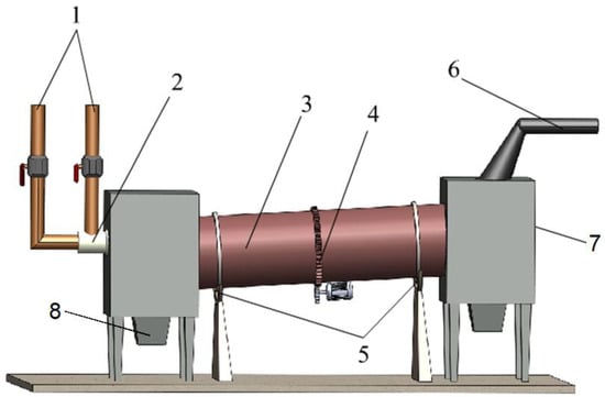 Schematic of the rotary kiln used in this study: 1—gas and air supply; 2—burner; 3—rotary kiln; 4—kiln drive system; 5—rollers; 6—gas discharge; 7—charging; 8—metal discharge.