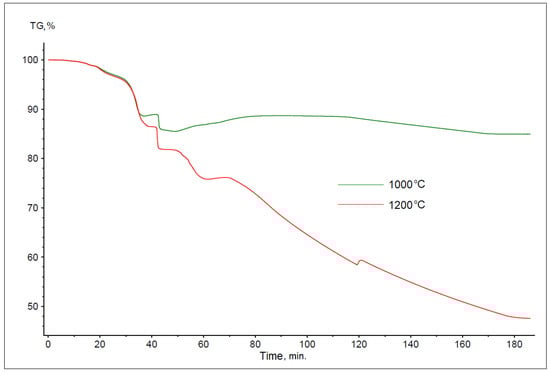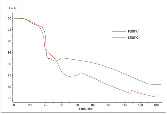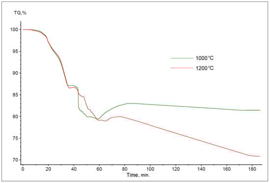 The thermogravimetric curves obtained for the reduction process of battery paste using flotoconcentrate are shown in Figure 4. As with anthracite dust, the course of the TG curves varies depending on the process temperature. The determined total weight losses of the samples were 18.59% for a temperature of 1000 °C and 29.21% for a temperature of 1200 °C.
