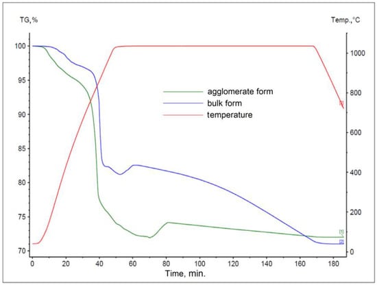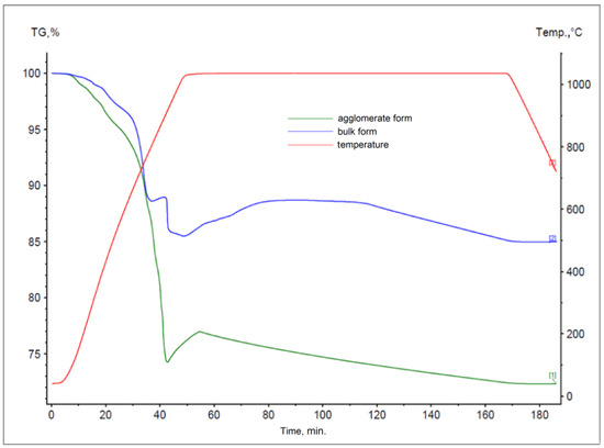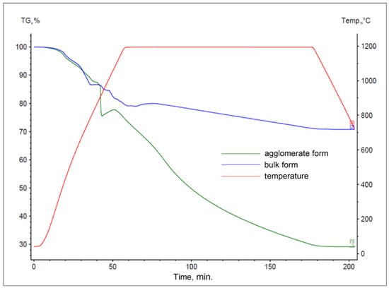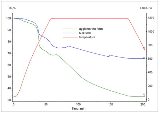 Temperatures of 1000 and 1200 °C were selected as the isothermal holding temperatures of the samples during the TG analysis. A 10% addition of carbon-bearing material was used. In order to determine the effect of the form of the material introduced into the thermal analyzer on the speed of the reduction process, this study included carrying out measurements for the material both in bulk form and subjected to agglomeration.