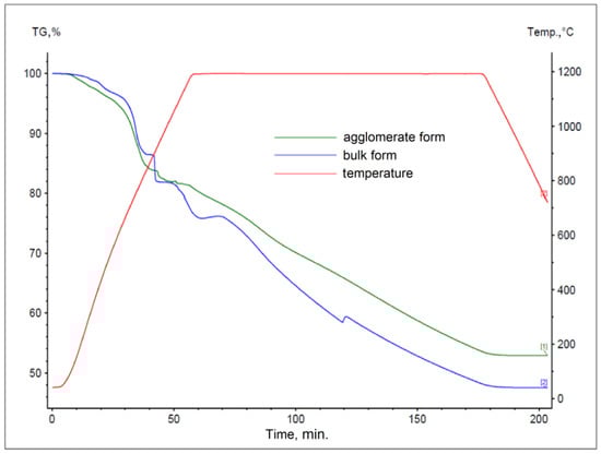 The results obtained for materials subjected to the agglomeration process are shown in Figure 6, Figure 7, Figure 8, Figure 9, Figure 10 and Figure 11, with the curves obtained for materials in bulk form also plotted for comparison. By analyzing the recorded thermogravimetric curves, it was found that in the case of samples containing anthracite dust and coke as carbon-bearing materials, there was a clear effect of the form in which the material was introduced for testing. The use of material in the form of agglomerate affected the weight loss of the samples, regardless of the process temperature. For samples where flotoconcentrate was used as the carbon-bearing material, an analogous effect occurred for the sample at 1200 °C. For the process taking place at a lower temperature, there was no clear relationship between sample weight loss and the form of material introduced into the process.