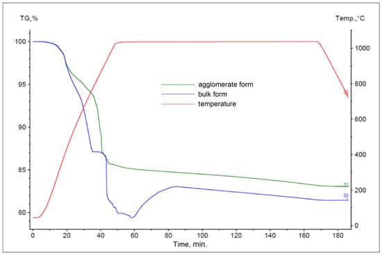 Before the experiment, a sample of a certain mass (about 150 mg) was placed in a DTA/TG (Differential Thermal Analysis/Thermogravimetric Analysis) crucible made of Al2O3 and then attached to a measuring head in the analyzer’s working chamber.
