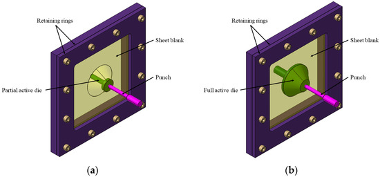 Principle of the incremental forming process with conjugate active die with (a) partial active die and (b) full active die.