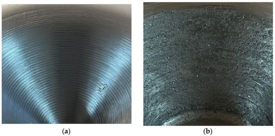 The area of contact between the punch and the blank is small, resulting in high contact pressure, which leads to increased frictional resistance. The friction between the punch and the blank has a large influence on the deformability of the material and the surface quality. To reduce the effects of friction, there are two solutions: the use of a punch with a ball and/or the use of lubrication. The use of a ball punch can improve the surface quality, as presented in Section 3.2. However, the friction between the punch and the blank can be reduced by the use of lubricants, and the surface quality can be improved considerably. Figure 6 shows the difference between a part where a lubricant has been used and a part where no lubricant has been used.