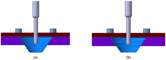The in-plane contour curve toolpath can be further categorized according to the type of step with which the indentation is made, namely vertical and angular step. In the case of the vertical-step toolpath, the punch moves in the axial direction with a constant step (∆z) after each in-plane contour curve. Blaga and collaborators compared the influence of the vertical step with that of the angular step on the forces obtained during the incremental forming of DC04 steel blanks [72]. Skjoedt and collaborators presented a method to use this type of toolpath for more complex shaped parts as well [73]. The spiral toolpath is continuous and provides stability in terms of forming forces and better quality of machined surfaces [74]. In contrast, the other toolpath is discontinuous and worsens the quality of parts machined by incremental forming [75].