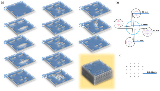 Microfluidic platform configuration. (a) Schematic 3D representation of the microfluidic platform: individual layers and overlapped view. (b) Overlayed reaction area: blue—channel for iron precursors solution (layer 9); red—channels for salicylic–silica solutions (layer 9); black—vortex mixing chamber and its dimensions (layer 8); purple—collecting channels (layer 7). (c) Reactant inlet dimensions (layer 9). Adapted from our previous study [32].