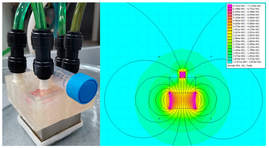 (left) The experimental set-up and (right) the FEMM model of the magnetic field configuration.