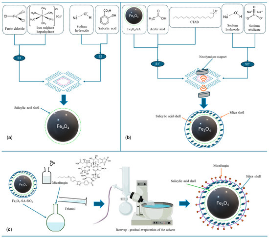 Schematic representation of nanocomposite preparation. (a) Microfluidic synthesis method for the production of Fe3O4-SA NPs. (b) Microfluidic synthesis method for the production of Fe3O4-SA-SiO2 NPs. (c) Micafungin drug loading onto Fe3O4-SA-SiO2 NPs via gradual solvent evaporation.