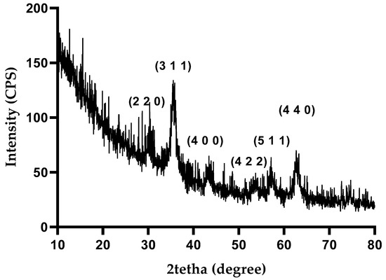 The X-ray diffraction (XRD) analysis was conducted to identify the crystalline phases present in the synthesized nanoparticles. Figure 4 shows the diffractogram of Fe3O4-SA-SiO2, where sharp diffraction peaks at 2θ values of 30.31, 35.71, 43.31, 53.90, 57.61, and 62.81 are visible. These peaks, corresponding to scattering from specific planes, denoted by the Miller indices (220), (311), (400), (422), (511), and (440), align well with the characteristic diffraction pattern of magnetite, as referenced by the American Society for Testing Materials (ASTM), sheet code 01-075-160 [33].