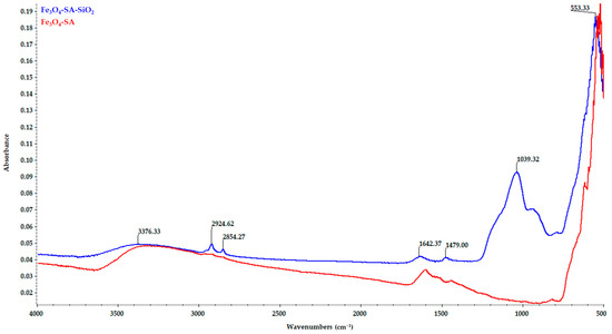FT-IR spectra—comparisons between Fe3O4-SA and Fe3O4-SA-SiO2.