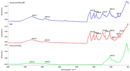 The effective loading of the nanostructured material with the bioactive compound micafungin was evidenced in the FT-IR spectrum. The FT-IR spectrum of pure micafungin compared to the FT-IR spectra of Fe3O4-SA-SiO2-micafungin and Fe3O4-SA-SiO2 are shown in Figure 6. The broad band at 3314 cm−1 is attributed to the following: the -OH stretching vibration and the stretching vibration of CH at 2932 cm−1 and 2866 cm−1, respectively. The signals detected at 1615, 1504, and 1434 cm−1 belong to the stretching of C=C aromatic bonds. The FT-IR spectrum of the Fe3O4-SA-SiO2-micafungin nanostructured material does not show significant changes, and the characteristic band of magnetite corresponding to the vibration of the Fe-O bond can be observed at 547 cm−1.
