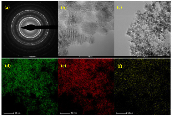 The structure and phase composition of the nanomaterials were analyzed using transmission electron microscopy (TEM). The TEM micrographs were acquired on a Tecnai™ G2 F30 S-TWIN electron microscope, equipped with selected area electron diffraction (SAED) from FEI (Hillsboro, OR, USA). The microscope was operated in transmission mode at an accelerating voltage of 300 kV, achieving point and line resolutions of 2 Å and 1.02 Å, respectively. The TEM specimens were prepared by dispersing the nanopowders in ethanol, followed by 15 min of ultrasonic treatment. The sample was then deposited onto a carbon-coated copper grid and allowed to dry at room temperature.