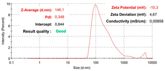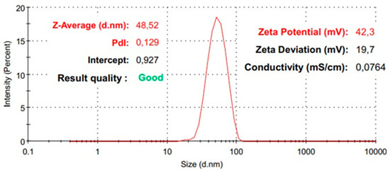 The dynamic light scattering (DLS) technique was used for particle size distribution using a Nano ZS Zetasizer (Malvern Instruments, Malvern, UK)-type device. The measurements were performed at a spreading angle of 90° and at a temperature of 25 °C. Three data acquisitions were made per sample, resulting in the relevant average diameter and polydispersity index values.