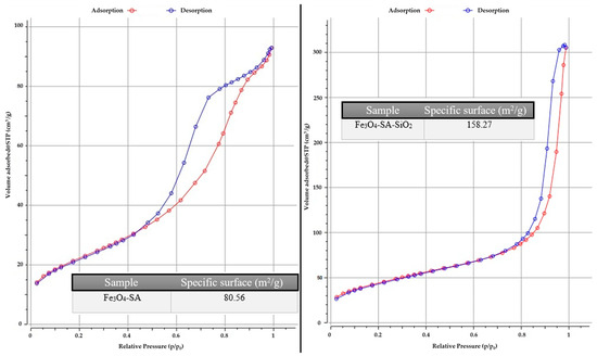 Considering the complexity of generating a silica shell on a magnetic core functionalized with salicylic acid under microfluidic vortex-type synthesis conditions, it is necessary to evaluate properties such as the specific surface area, size, and volume of the pores. These characteristics were determined by measuring the gas adsorption on the material’s surface and subsequently applying the BET model for the analysis (Figure 10). Therefore, the results obtained for the Fe3O4-SA sample show the values of the specific surface of 80.56 m2/g, with a large specific surface that is correlated with the fine powder and the presence of a small nanoparticle agglomeration. On the other hand, the result obtained for the sample Fe3O4-SA-SiO2 indicates a value of 158.27 m2/g, correlated with a very high specific surface. Supplementary information regarding pore size and pore volume was collected for each sample. The Fe3O4-SA sample has values for pore size, dBJH, of 7.0320 nm and pore volume, Vp, of 0.1355 cm3/g, and for the Fe3O4-SA-SiO2 sample, both values increase, reaching values for pore size, dBJH, of 22.127 nm and pore volume, Vp, of 0.4674 cm3/g. This is due to the creation of the silica shell on the magnetic core, which substantially improves the intended application in terms of the adsorption process of the antifungal drug. The isotherm shapes indicate a mesoporous-associated type of isotherm, recorded for Fe3O4-SA-SiO2.
